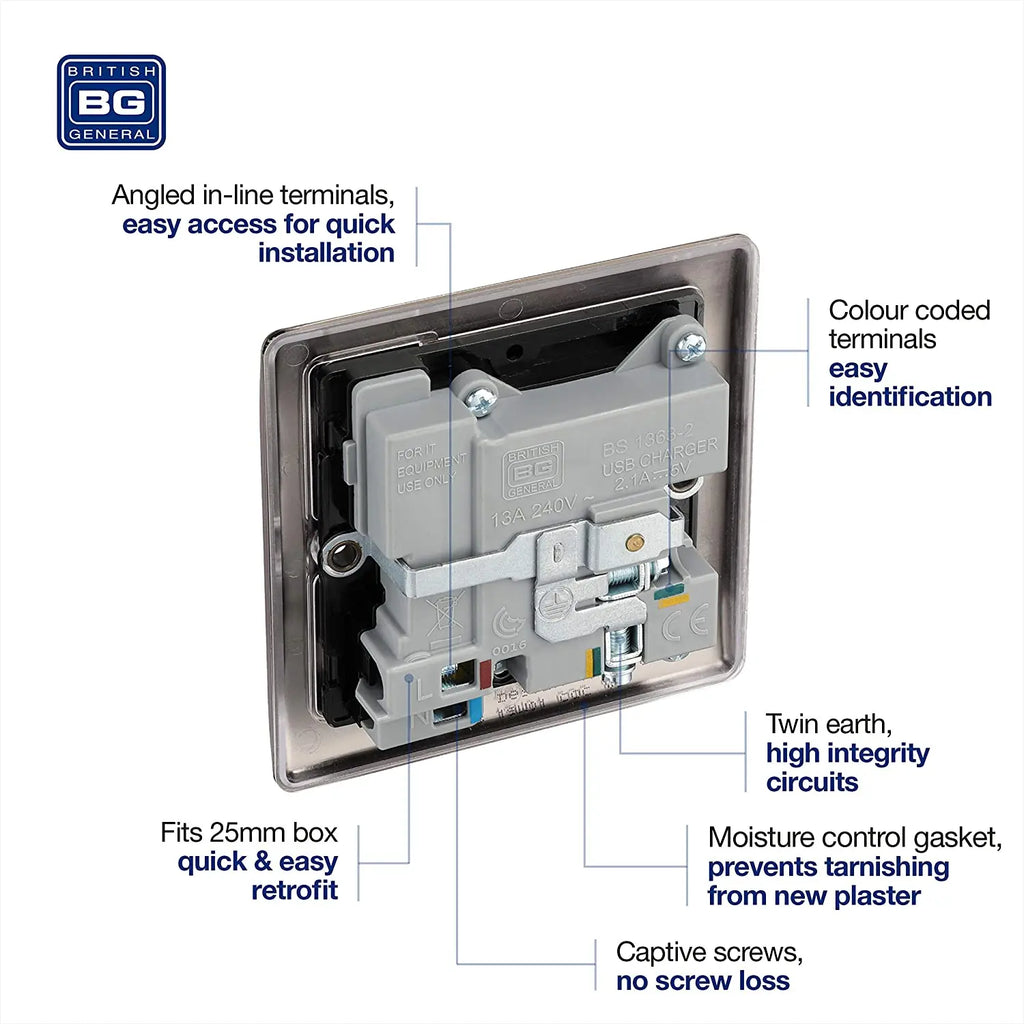 Angled in-line colour coded captive screw terminals: makes it incredibly easy to install and to connect the wires, setting it up as one terminal – even with the addition of the USB ports fixed integrated plastic gasket to protect metal edges from moisture: with no visible plastic to be seen around the switches and a lightly lacquered surface to reduce fingerprint marks bg electrical is part of luceco plc.