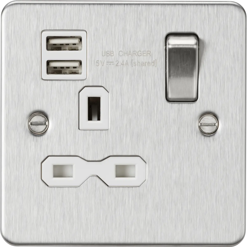 Knightsbridge 13A 1G SP Switched Socket with Dual USB A+A (5V DC 2.4A shared) - Brushed Chrome with White Insert – FPR9124BCW