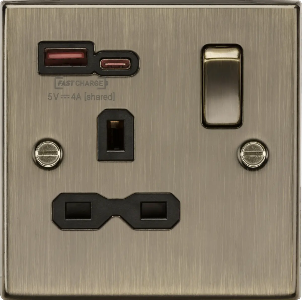 Knightsbridge 13A 1G SP Switched Socket with Dual USB A+C 12V DC 1.5A [Max. 18W] - Antique Brass with Black Insert – CS9919AB