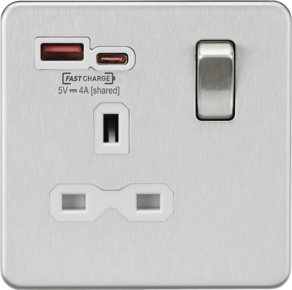 Knightsbridge 13A 1G SP Switched Socket with Dual USB A+C 12V DC 1.5A [Max. 18W] - Brushed Chrome w/White Insert – SFR9919BCW
