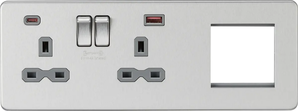 Knightsbridge 13A 2G DP Socket +2G Modular + Dual USB A+C 12V DC 1.5A (Max. 18W) - Brushed Chrome w/Grey Insert – SFR992LBCG