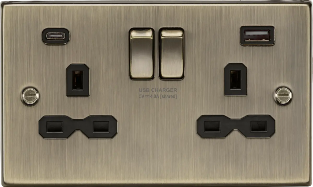 Knightsbridge 13A 2G SP Switched Socket with Dual USB A+C (5V DC 4.0A shared) - Antique Brass with Black Insert – CS9940AB