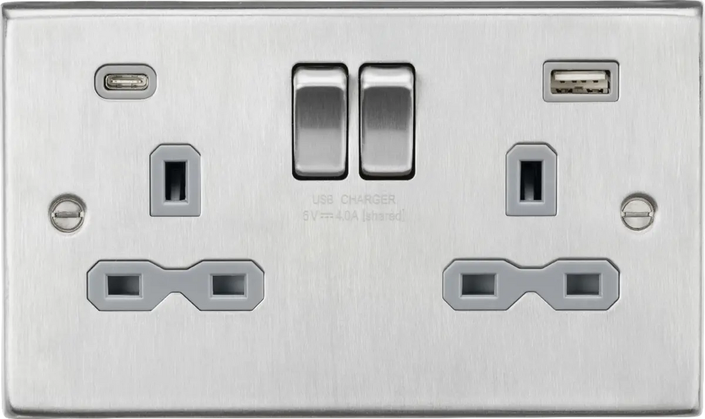 Knightsbridge 13A 2G SP Switched Socket with Dual USB A+C (5V DC 4.0A shared) - Brushed Chrome with Grey Insert – CS9940BCG