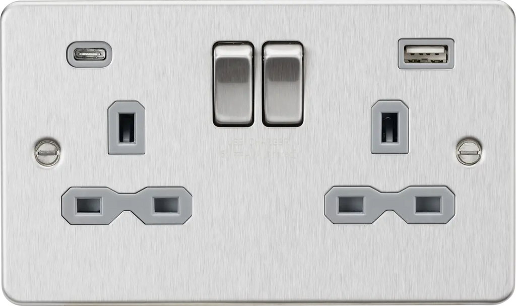 Knightsbridge 13A 2G SP Switched Socket with Dual USB A+C (5V DC 4.0A shared) - Brushed Chrome with Grey Insert – FPR9940BCG