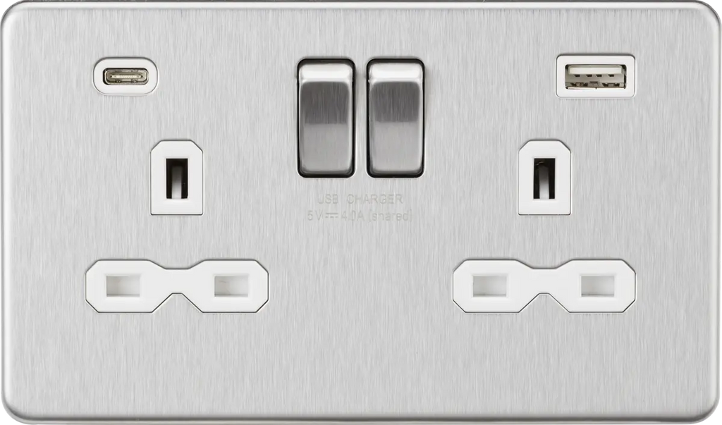 Knightsbridge 13A 2G SP Switched Socket with Dual USB A+C (5V DC 4.0A shared) - Brushed Chrome with White Insert – SFR9940BCW