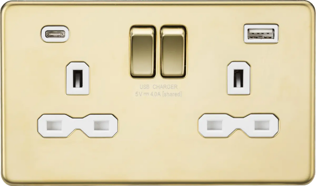 Knightsbridge 13A 2G SP Switched Socket with Dual USB A+C (5V DC 4.0A shared) - Polished Brass with White Insert – SFR9940PBW