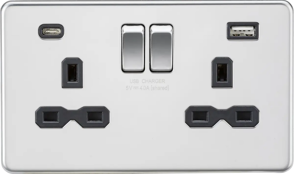 Knightsbridge 13A 2G SP Switched Socket with Dual USB A+C (5V DC 4.0A shared) - Polished Chrome with Black Insert – SFR9940PC