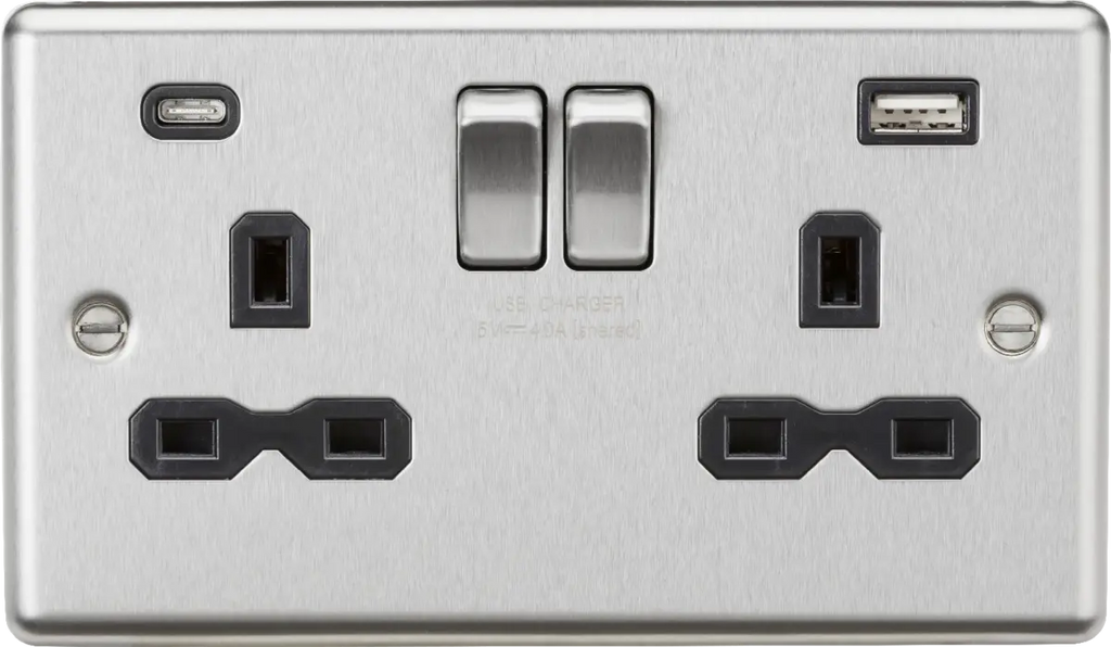 Knightsbridge 13A 2G SP Switched Socket with dual USB C+A 5V DC 4.0A [shared] - Brushed Chrome with black insert – CL9940BC