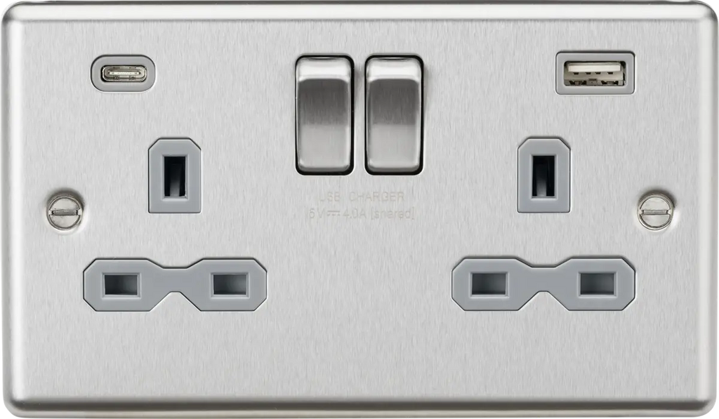 Knightsbridge 13A 2G SP Switched Socket with dual USB C+A 5V DC 4.0A [shared] - Brushed Chrome with grey insert – CL9940BCG
