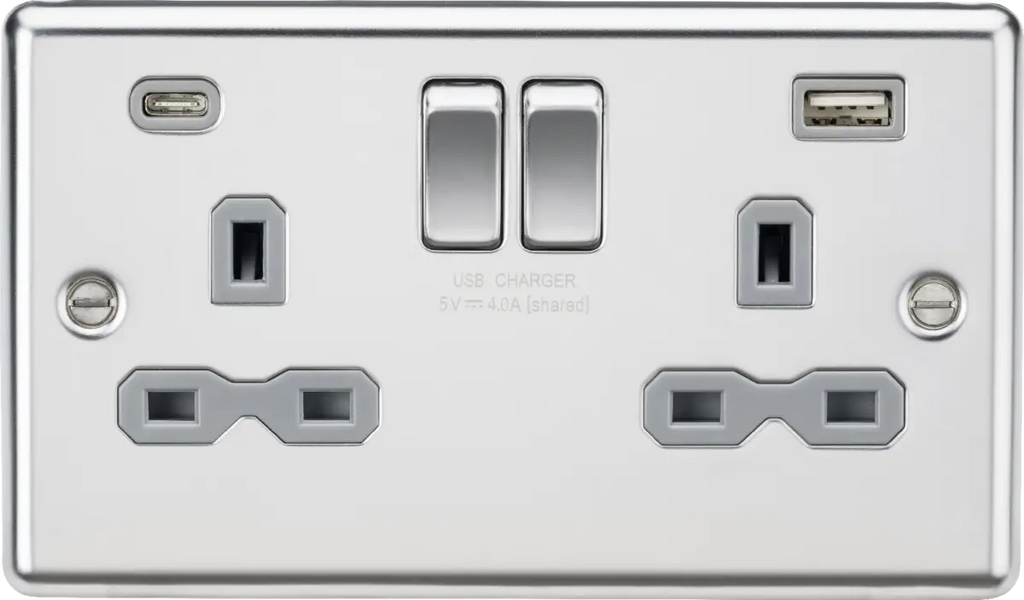 Knightsbridge 13A 2G SP Switched Socket with dual USB C+A 5V DC 4.0A [shared] - Polished Chrome with grey insert – CL9940PCG