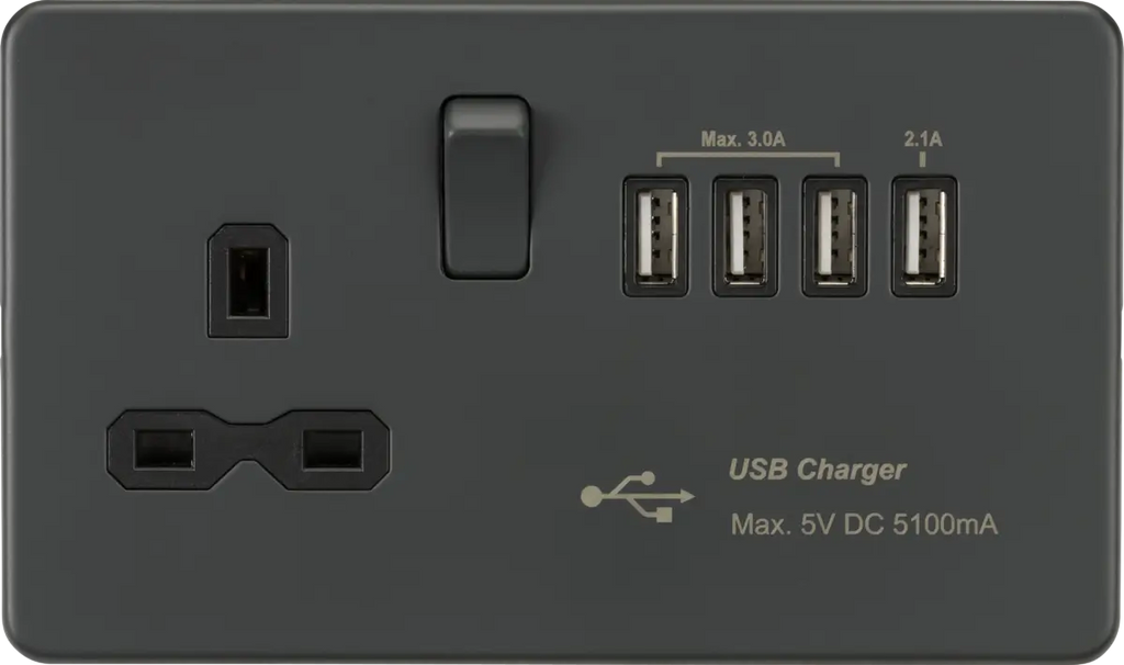 Knightsbridge 13A Switched Socket with Quad USB-A (5V DC 5.1A shared) - Anthracite with Black Insert – SFR7USB4AT