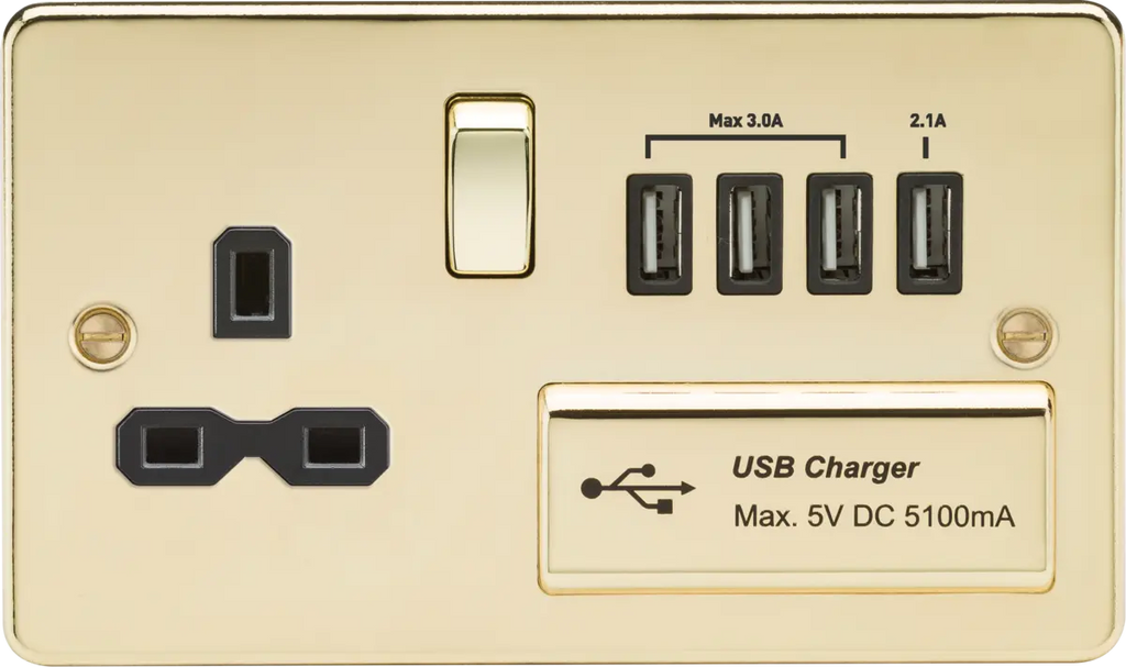 Knightsbridge 13A Switched Socket with Quad USB-A (5V DC 5.1A shared) - Polished Brass with Black Insert – FPR7USB4PB