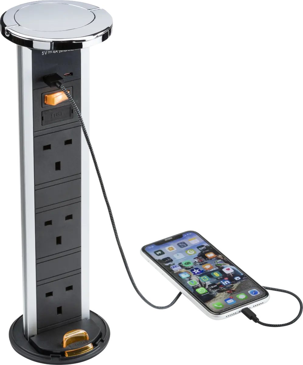 Great for use in kitchen counter tops, desktops in office and boardrooms and hotel rooms. Whenever a discreet power solution is desired. This device has a secure clip that locks the unit upright when in use. You can also use the unit when it’s closed thanks to the innovative cable management cap and inverted socket positions. This device also benefits from Knightsbridge FASTCHARGE USB sockets which can deliver a 0-50% charge in under 30 minutes with compatible devices. FASTCHARGE is achieved by the intelligent switching of voltages between 5V to up to 12V to optimize and deliver the maximum input your device can handle. Your device decides how much power it’s going to draw down. Features - 3 x 13A sockets - Back lit On/Off rocker switch - Fitted with 2m cable and BS plug top for easy installation - Aluminum casing with die-cast decorative metal cap and handle - Require mounting board thickness: 10-50mm - Cut out: Circular 90-92mm (allowing a minimum 25m clearance around the cut hole) - Fully certified to the latest British Safety Standards Benefits - IP54 rating – unique waterproof design (when closed) - Built in Dual USB FASTCHARGE A+C - 5V DC 3A 15W / 12V DC 1.5A 18W QC/PD (5V DC 4.0A 20W Max shared) WE RECOMMEND ONLY USING CERTIFIED USB CABLES FOR SAFETY, OPTIMUM PERFORMANCE AND TO ENSURE COMPATIBILITY IMPORTANT: THE DEVICE CONTROLS THE POWER BEING DRAWN, NOT THE SOCKET MOST COMPATIBLE DEVICES WILL ONLY ACTIVATE FASTCHARGE BETWEEN 0-70% BATTERY POWER AFTER THIS IT WILL REVERT TO STANDARD CHARGING PARAMETERS TO PROTECT BATTERY NB: USB-C PORT NOT COMPATIBLE WITH IPHONE15, IPHONE15 CHARGING ONLY SUPPORTED VIA WIRELESS PAD OR OVER USB-A PORT (IPHONE15 DOES NOT SUPPORT VOLTAGE SWITCHING FAST CHARGING)