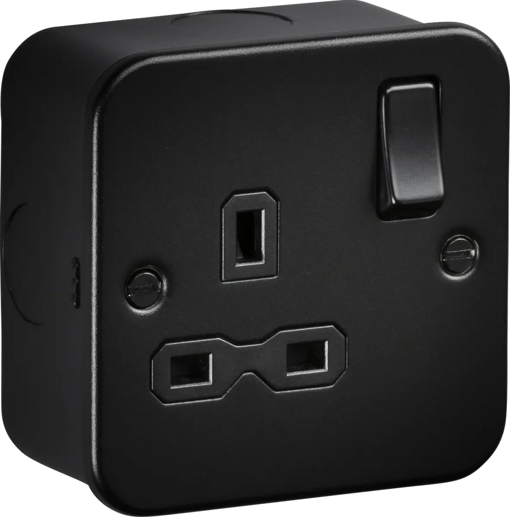 Part of the Knightsbridge Metal Clad Black range, this socket offers durable switched socket outlets suitable for general-purpose power distribution, with a factory‑fitted gasket, multiple 20mm knockouts and a durable powder‑coated surface to withstand knocks, dust and everyday wear.