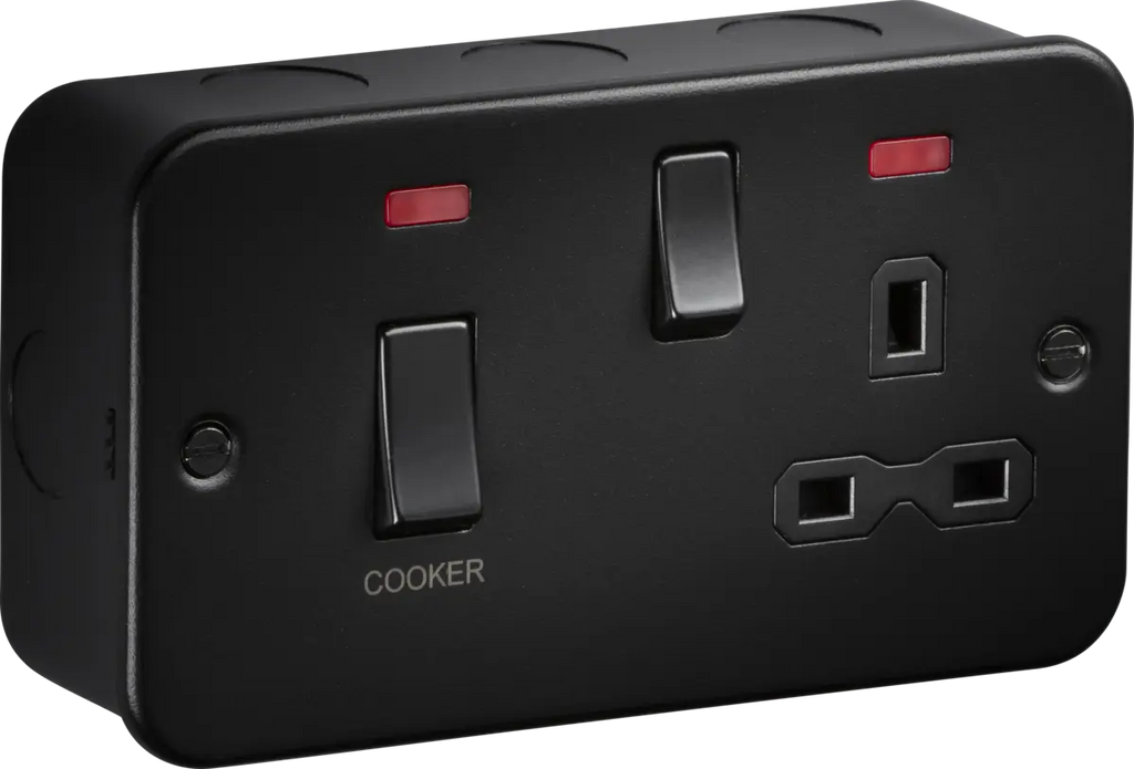 This Knightsbridge Metal Clad Black 45A DP Switch and 13A DP Switched Socket with Neons is designed for tough commercial and industrial use, combining a heavy-duty metal clad body with a textured sand black finish for a smart, hard-wearing appearance.